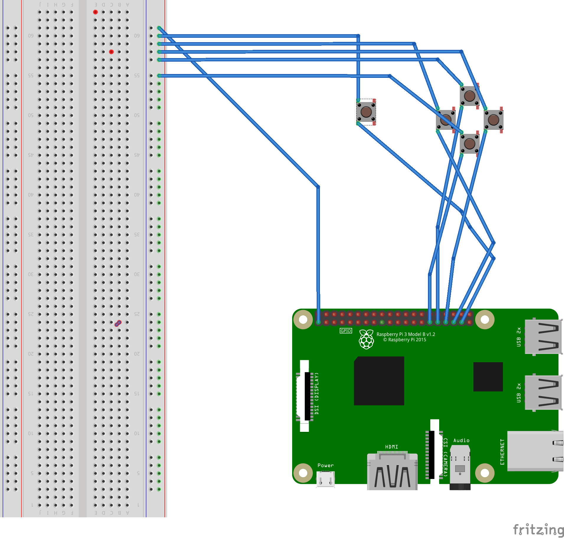 Unten links: Raspberry Pi, unten rechts: Netzteile, unten: Breadboard, oben: Display, Hintergrund: Joystick und Button + Verkabelung