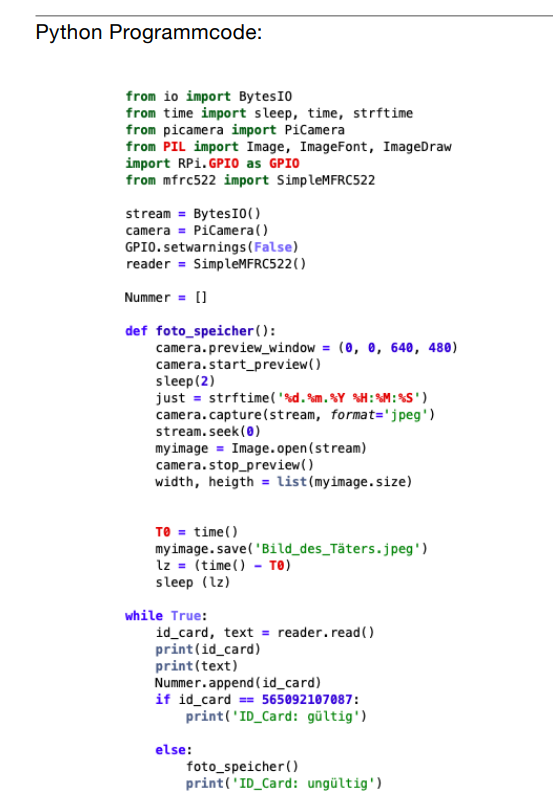 Es wird in der Ausgabe angezeigt, welche ID-Karte gescannt wurde und den Status der Karte „gültig“ oder „ungültig“. Bei ungültiger Karte wird die Kamera geöffnet und ein Foto gemacht. Dieses Foto wird abgespeichert.