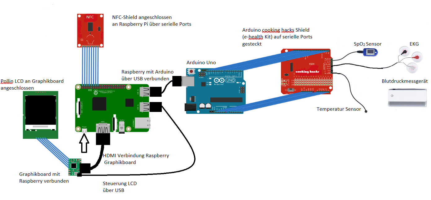 Zielsetzung dieses Projektes ist es eine anwenderfreundliche Möglichkeit zu schaffen, um mithilfe der Sensoren des e-health Kits medizinische Messungen durchzuführen und diese auf einem Bildschirm auszugeben.
