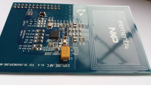 Das NFC-Shield (Near Field Communication) wird direkt auf die GPIOs des Raspberry gesteckt und kann sowohl per SPI, als auch I²C angesprochen werden. Hiermit können NFC-Karten ausgelesen werden. Außerdem wird auch aktiviertes NFC eines Mobiltelefons unterstützt.