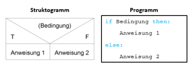 Der Anweisungsblock 1 wird nur dann ausgeführt, wenn die Bedingung zutreffend ist (wahr, True, logisch 1). Ist jedoch die Bedingung nicht zutreffend, so wird der Anweisungsblock 2 ausgeführt.
